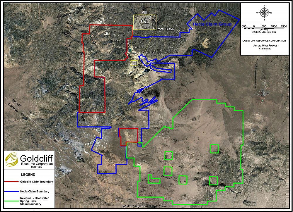 The Sawtooth Ridge target on Goldcliff’s claims is located immediately northwest of the northern-most bonanza vein deposits in the Aurora district. The target consists of a large 1.5 square mile area of high-level opaline, chalcedonic silica and argillic alteration, hosted by rhyolitic tuffs, flows and shallow intrusive domes. A series of northeast and north trending faults transect the area. The target occurs stratigraphically and structurally above the productive andesite host unit of the main district, and may represent the intact portion of the epithermal system, with uneroded and unmined bonanza veins at depth below the high-level alteration. A shallow drill hole in the area completed in 1989 contained 10 metres of 3 g/t gold, and received only limited follow-up in 1990 with no drilling since. Some of the original data for this drill intercept is missing therefore the information is not being relied upon. Goldcliff plans to drill a twin hole to verify the information. The mineralization appears associated with a NE-trending chalcedonic silica rib that parallels the main productive bonanza veins of the district.